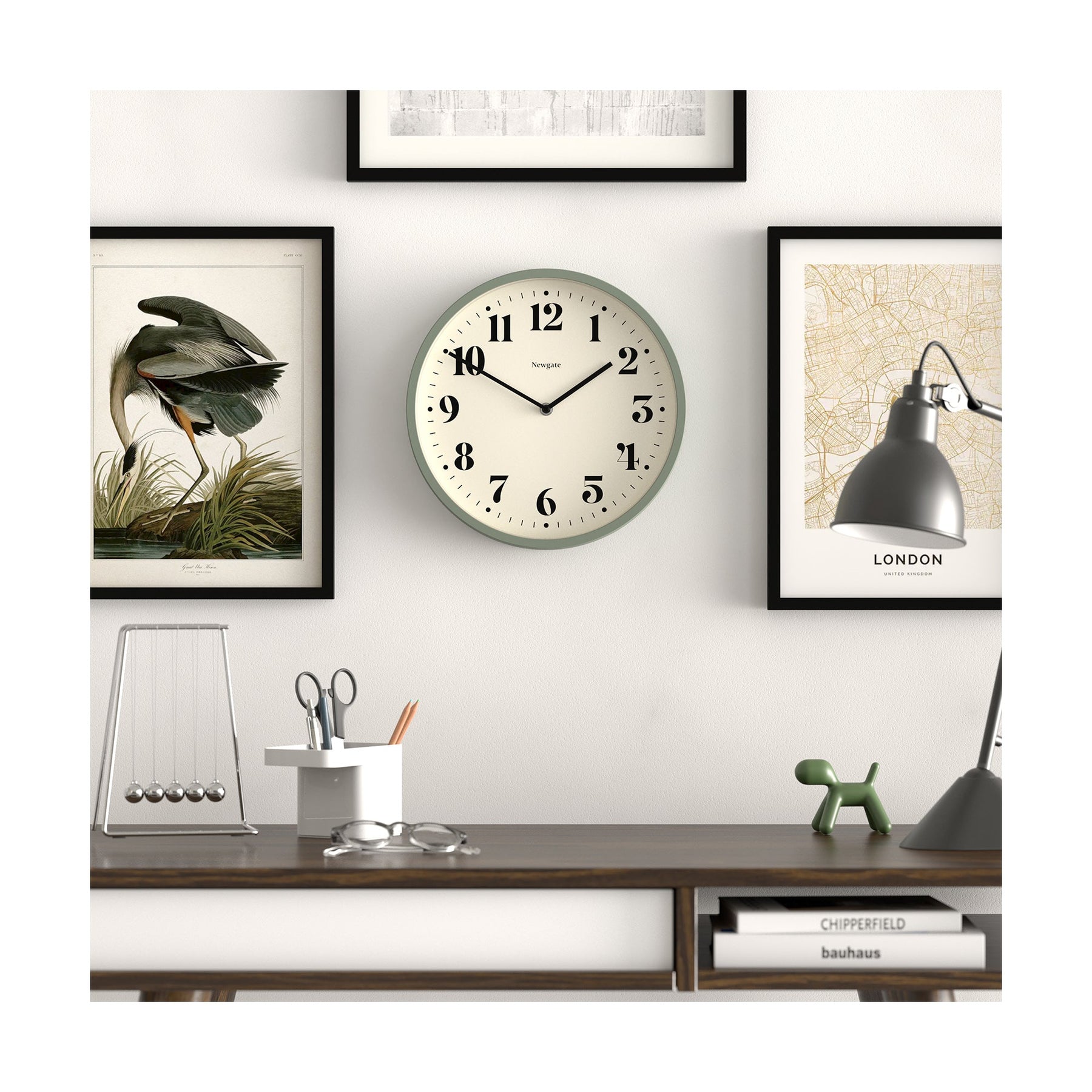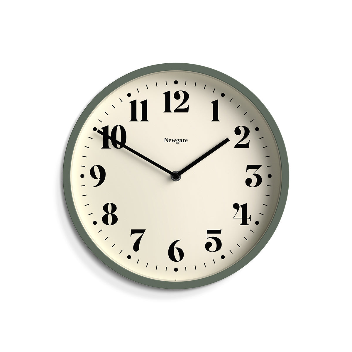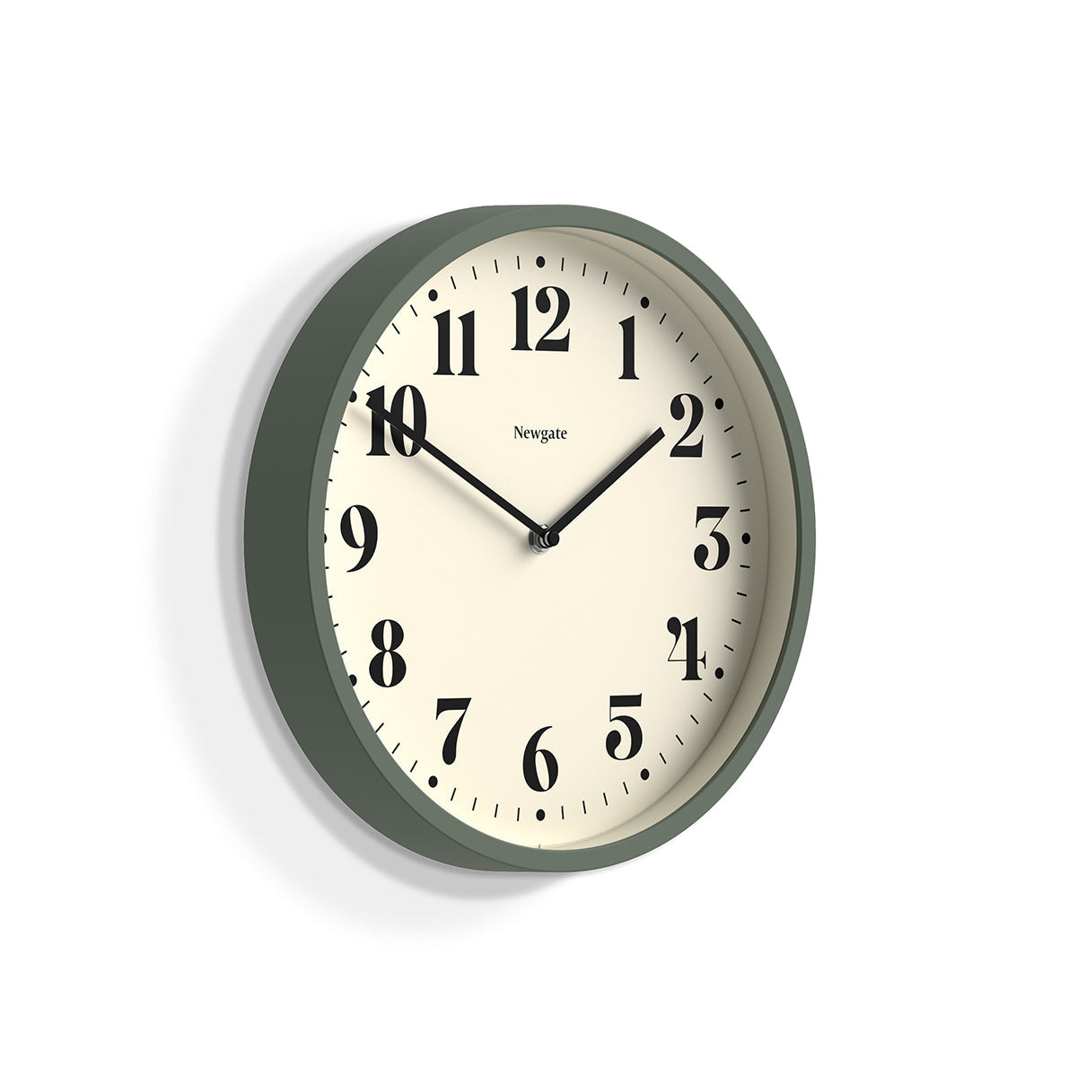 A modern wall clock with a contemporary theatre dial and matt asparagus green painted case.